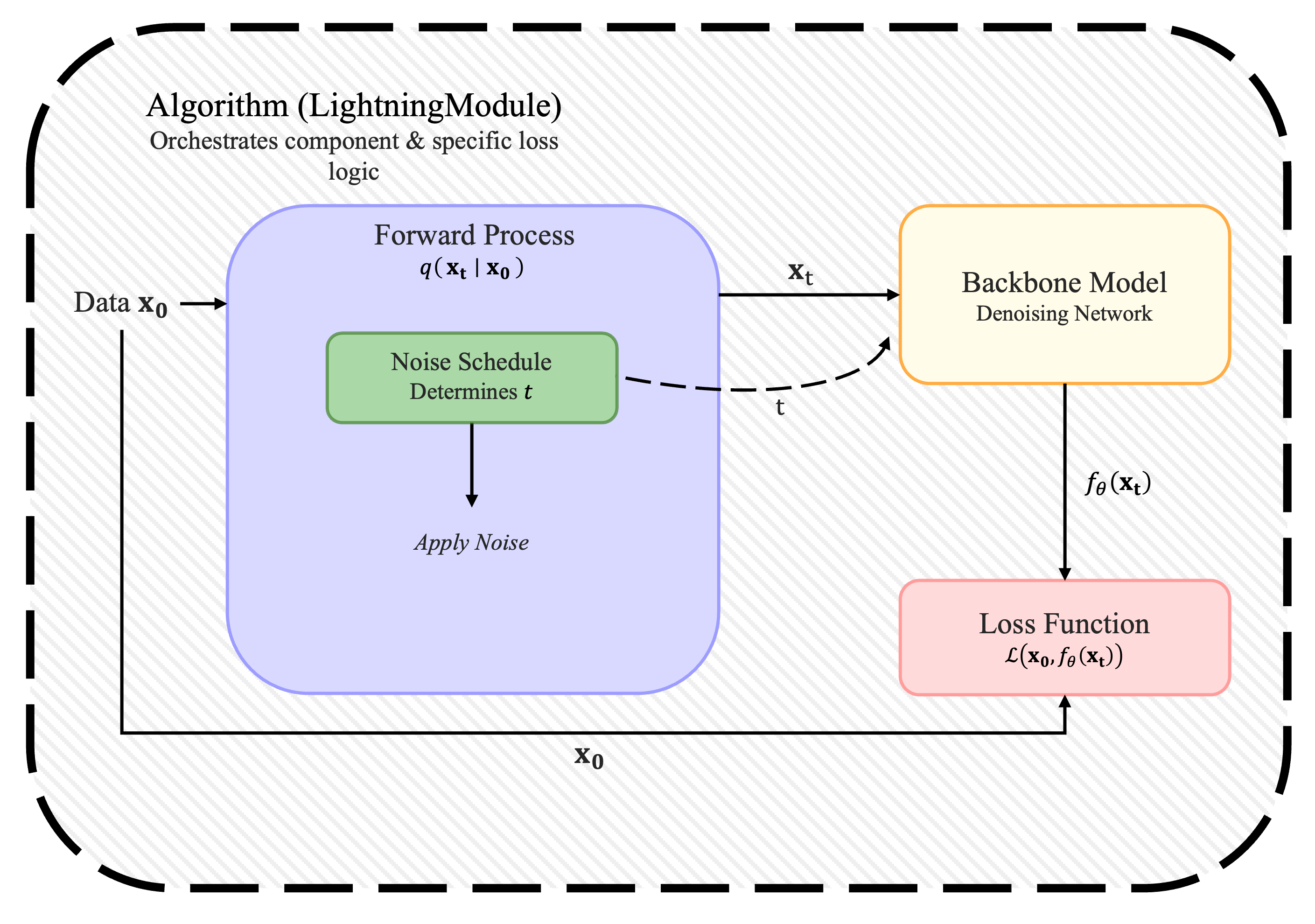 The library follows a modular design where Algorithms coordinate training and inference by combining interchangeable components. A LightningModule (Algorithm) orchestrates the interaction between components and defines the specific loss computation logic, connecting the Forward Process (noise), Noise Schedule (timing), Backbone Model (denoising), and Sampler (generation).